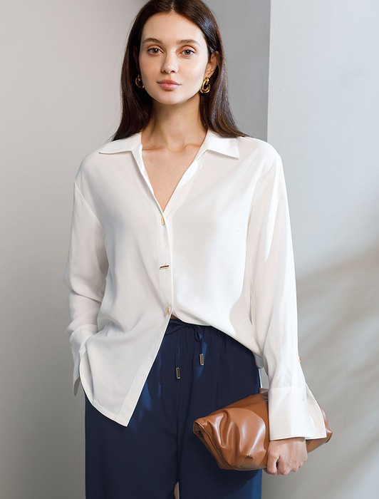 Состав: 55%Вис 45%Лиоцелл (Вис) Плотность: 115 Г/м2Блузка натурального белого цвета сочетает в себе комфорт и элегантность благодаря материалу из вискозы с лиоцеллом. Аккуратный отложной воротник подчеркивает утонченность образа, а продолговатые металлические пуговицы золотистого цвета добавляют выразительный акцент и придают блузке благородный вид. Широкие манжеты на рукавах привлекают внимание и делают силуэт современным. Спущенная линия плеча формирует расслабленный, но стильный внешний вид, что идеально для тех, кто ценит индивидуальность и уверенность в деталях. Крой продуман так, чтобы подчеркивать достоинства фигуры и на больших размерах, создавая гармоничный силуэт без лишних усилий. Ткань из вискозы с добавлением лиоцелла обеспечивает приятные ощущения и отличную посадку, струится на теле и охлаждает в жаркую погоду. При пошиве использована технология «чистый край» по всей длине центральной планки и низу изделия. Это признак премиум качества — «чистый край» вместо оверлока. Блузку можно носить с топом, не застегивая — при этом распахнутая блузка будет выглядеть максимально эстетично.Рубашка легко впишется как в деловой гардероб, так и в повседневный стиль, позволяя выглядеть безупречно независимо от ситуации.