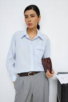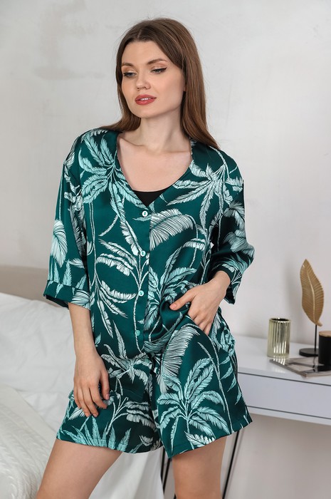 Блуза (рубашка) женская из тканого синтетического полотна с набивным рисунком, свободного покроя, с V- образным вырезом горловины, короткими втачными рукавами, центральной бортовой застежкой на обметанные петли и пуговицы. В боковых швах разрезы, по низу рукавов манжеты, горловина обработана обтачкой.