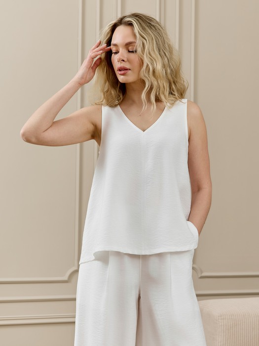 Блуза -топ из гладкокрашеного фактурного полотна средней длины, расширенный книзу, с горловиной v-образной формы. Полочка и спинка - со средними швами. Горловина и проймы окантованы основным материалом, низ изделия обработан подгибкой.