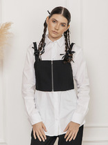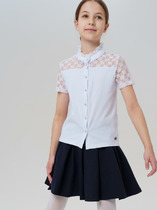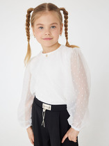 Блузка для девочки из трикотажного полотна с длинным рукавом, прилегающего силуэта средней длины. Вырез горловины округлый, декорирован вязанным ажурным воротником, по центру декоративный бантик.
