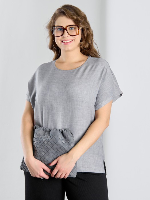 Блуза женская из гладкокрашеного тканого полотна, прямого силуэта, с горловиной овальной формы и цельнокроеными рукавами. Горловина окантована основным материалом, в боковых швах небольшие разрезы.