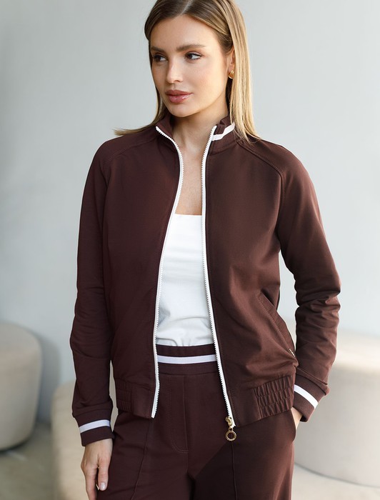 Состав: 95%Хлопок 5%ПУ Плотность: 240 Г/м2Бомбер коричневого цвета среднего объема с застежкой на молнию выполнен из премиального футера двухнитки плотностью 240 Г/м2. Натуральный состав ткани обеспечивает дышащий эффект, мягкость и приятные тактильные ощущения, Эластичный материал позволяет свободно двигаться без стеснения, а также отлично сохраняет форму даже после длительного ношения. Гладкая лицевая сторона придает бомберу опрятный и дорогой вид. Повседневный бомбер отличается аккуратным силуэтом без лишнего объема и универсальной длиной, которая идеально подходит для повседневного образа. Манжеты на рукавах и широкая резинка по низу обеспечивают надежную посадку, сохраняя тепло в прохладную летнюю погоду. Особенность бомбера - контрастные полосы на горловине и манжетах, которые добавляют современный акцент и делают его более выразительным. Представленная размерная линейка позволяет подобрать оптимальный вариант для любой фигуры и размера, на маленький или плюс сайз, обеспечивая свободу движений без компромиссов по стилю. Этот легкий бомбер станет отличным дополнением к базовому или спортивному гардеробу, сочетая практичность и стиль.