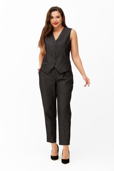 Брюки по переду со складками и боковыми карманами. Застежка на тесьму молнию спереди и петлю и пуговицу по поясу, пояс с эластичной резинкой сзади