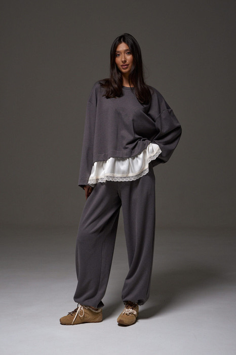 Брюки-джоггеры. Выполнены из мягкого текстильного ворсистого полотна графитового цвета. Характеристики: прямой крой, пояс на резинке, в боковых швах карманы, на задней части изделия имитация накладных карманов, штанина внизу на резинке с фиксатором. Длина 107 см.