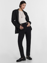 Брюки длинные, прямого силуэта, широкие. Выполнены из костюмной ткани белого цвета. Характеристика: По переду и спинке заутюжены канты. Пояс широкий притачной на резинке, с отделочными строчками. На передних частях брюк обработаны карманы с отрезным бочком. Длина брюк по боковому шву 112 см.