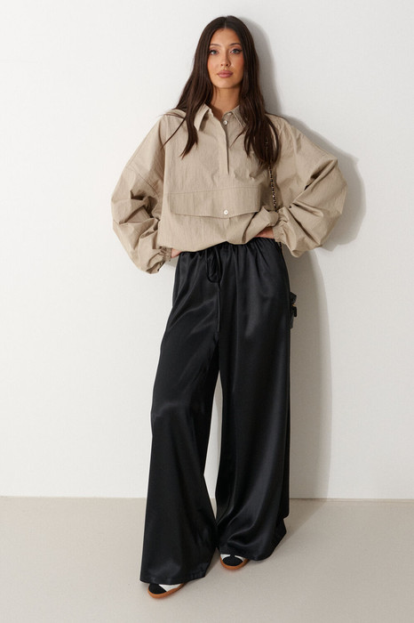 Брюки свободного кроя. Выполнены из мягкой струящейся ткани чёрного цвета. Пояс на резинке, со шнурочком. В боковых швах карманы. Длина бокового шва (с учётом пояса) 107 см