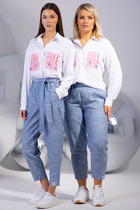 Брюки классические, по форме прямые, клешенные от лиии колена, застежка - потайная молния. Съёмный пояс из основной ткани, обработан пряжкой - в комплекте