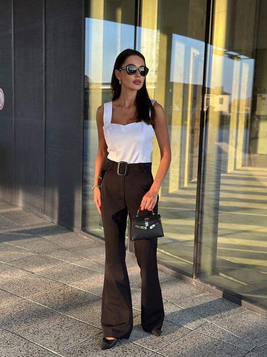 Брюки прямого силуэта с завышенной линией талии. В комплекте имеется накладной пояс с пряжкой. Застёжка - гуульфик с молнией. Ниже колена брюки имееют расклешенную форму. За счет своего силуэта стройнят и удлиняют ноги.