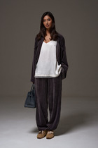 Брюки прямого силуэта с завышенной линией талии. Выполнены из синтетической кожи. В комплекте имеется накладной пояс с пряжкой. Застёжка - гуульфик с молнией. Ниже колена брюки имееют расклешенную форму. За счет своего силуэта стройнят и удлиняют ноги.