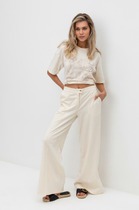 Брюки из плотного трикотажа с рубчиком, зауженные к низу, с боковыми карманами спереди и накладными сзади. Пояс - декоративная резинка со шрифтовым принтом. На отворотах низа брюк  так же шрифтовой принт.