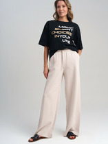 Брюки свободного кроя из мягкой, не мнущейся, струящейся, костюмной ткани. Эта модель создана для тех, кто любит одеваться стильно и при этом чувствовать себя комфортно. Брюки палаццо – настоящий тренд этого сезона. Главная особенность в том, что они делают любые ноги визуально длиннее. По передней части застрочена стрелка. Пояс притачной, частично с эластичной резинкой, дополнен декоративным удлинённым ремнём. В боковых швах имеются карманы с отрезным бочком.