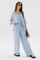 Такая модель придаст образу неповторимый летний шарм, добавив нотку игривости и романтичности. Они прекрасно сочетается как с лёгкой обувью на низком ходу, так и с туфлями на шпильке. Брюки отлично подойдут для прогулок по городу и пляжу, отдыха в кафе создавая образ свежести и элегантности.
