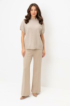 Брюки классические, из плотной текстильной ткани, прямые, слегка заужены к низу, заутюжены стрелки, по переду обработаны карманы с отрезным бочком, застежка на тесьму-молнию и 1 пуговицу. На задних половинках обработаны вытачки и имитация карманов в рамку с двумя обтачками, пояс в брюках притачной, без резинки.По низу брюк в боковом шве есть небольшой разрез. Длина брюк от талии по боковому шву 96 см.