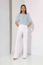 Брюки классические, из плотной текстильной ткани, прямые, слегка заужены к низу, заутюжены стрелки, по переду обработаны карманы с отрезным бочком, застежка на тесьму-молнию и 1 пуговицу. На задних половинках обработаны вытачки и имитация карманов в рамку с двумя обтачками, пояс в брюках притачной, без резинки.По низу брюк в боковом шве есть небольшой разрез. Длина брюк от талии по боковому шву 96 см.