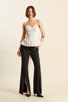 Брюки прямые,классические, с заутюженными стрелками,по переду обработаны карманы с отрезным бочком,застежка на тесьму-молнию и 1 пуговицу.На задних половинках обработаны вытачки и имитация карманов с листочкой, пояс в брюках притачной. Длина брюк от талии по боковому шву 100 см. К брюкам рекомендуем жакет 205-арт. 2 80 22