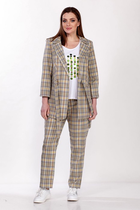 Брюки женские классические с высокой посадкой, полуприлегающего силуэта, выполнены из костюмной ткани в клетку с добавлением эластана. Пояс без резинки, с застежкой молнией на пуговицу. В боковых швах карманы с листочкой. Длина брюк 103 см.