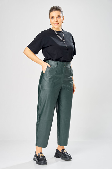 Брюки, зауженные к низу, по передним половинкам накладные карманы, застежка по линии банта на молнию, на задних половинках отрезная кокетка и накладные карманы. Верх брюк на пояса с застежкой на кнопки.