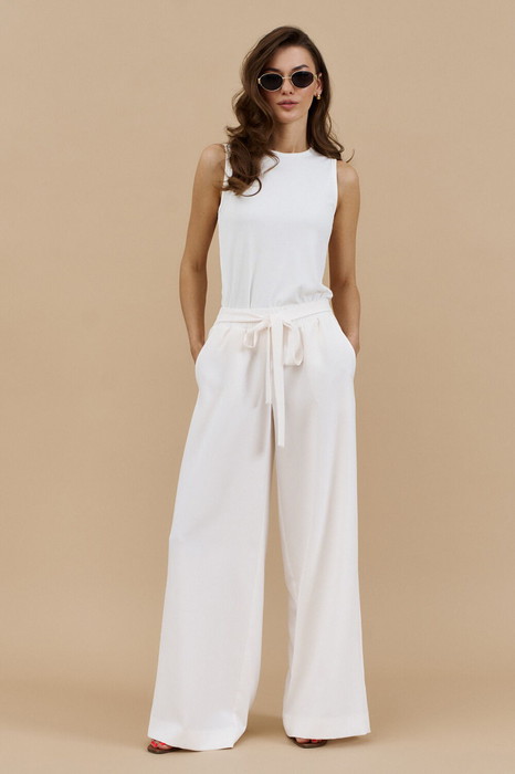 Брюки женские свободного силуэта. В боковых швах обработаны карманы-"хулиганы". Пояс на резинке, от боковых швов имеет дополнительные завязки-пояс.