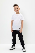 Брюки для мальчика изгладкокрашеного полотна "футер-двухнитка", на притачном поясе с эластичной тесьмой внутри и карманами в боковых швах. Средние половинки - из двух частей каждая, с отделочными строчками по швам стачивания. Нижние срезы обработаны подгибкой сэластичной тесьмой.