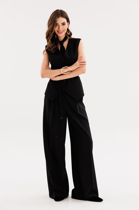 Брюки-палаццо выполнены из костюмной ткани. Брюки на притачном поясе, длиной в пол, по бокам лампасы из основной ткани, складки и боковые карманы. Застежка спереди на молнию. Передняя и задняя часть брюк заутюжены на кант.