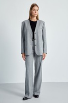 Брюки выполнены из однотонной костюмной ткани, заужены к низу, на задних половинках карманы с листочкой, застежка в боковом шве на металлическую молнию и пуговицу. По низу в боковом шве разрезы.