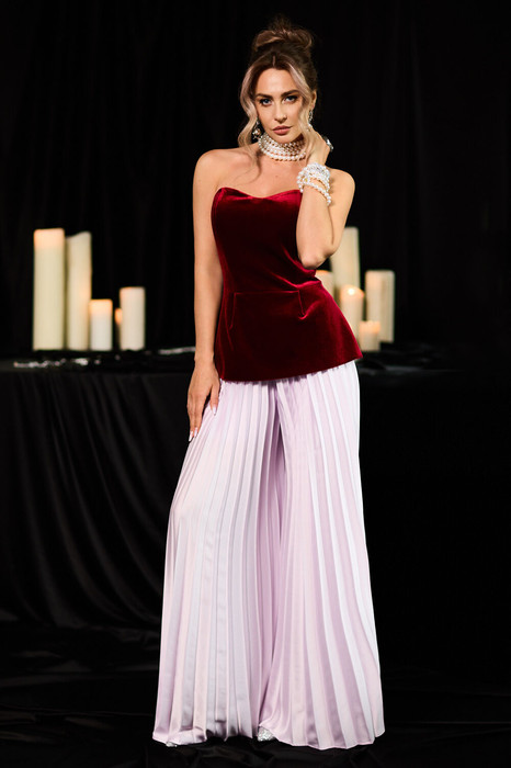 Брюки- гофре расширенного силуэта, с отрезным поясом, без застежки, верх брюк присборен на резинку. Брюки без боковых швов.