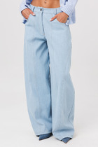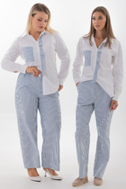 Широкие полосатые брюки. По переду расположены две складки, карманы в боковом шве. Пояс на резинке, для удобства в носке и хорошей посадки. По боковому на поясе расположены паты с декоративной пуговицей. Застежка по переду на брючную молнию. Идеальные брюки для тех, кто хочет мягкий сбодный образ. В комплекте идет пояс с жемчугом.