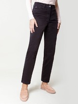 Брюки плотно облегают вверху и расширенные к низу, с притачным поясом-кокеткой со шлевками. Застежка на тесьму-молнию и 1 петлю и пуговицу. На передних частях брюк в боковых швах обработаны наклонные карманы с широкими листочками с втачными концами, на которых декоративно прикреплены по 2 пуговицы. На задних частях брюк обработаны вытачки. На передних половинках брюк заутюжены канты.