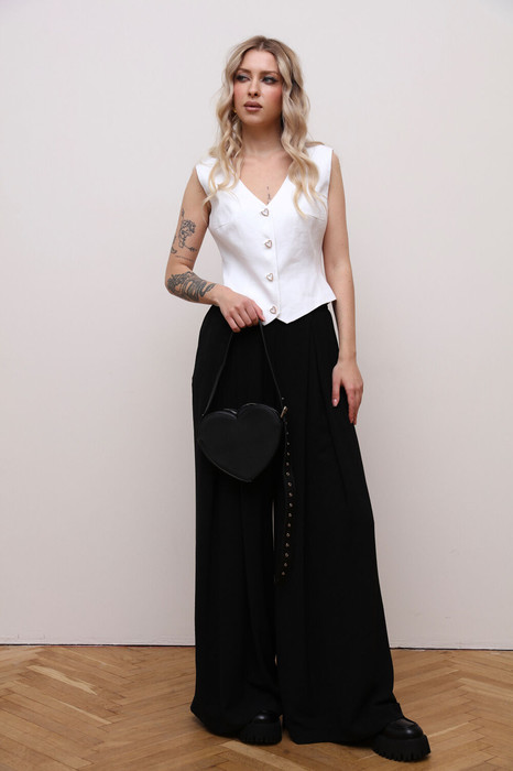 Брюки широкого объема.По центру переда заложены две широкие встречные складки на каждой половинке. В боковых швах расположены карманы с наклонным входом. Талия на резинке.