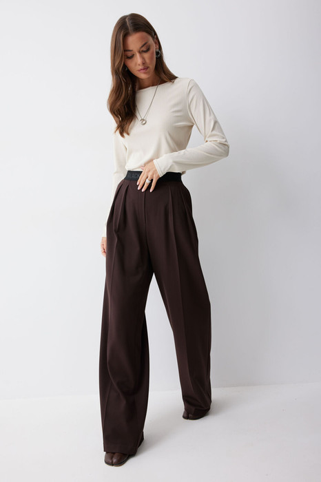 Брюки прямого силуэта из костюмной ткани. По верху брюк декоративная резинка. На передних половинках карманы и декоративные складки. На задних половинках вытачки. Обращаем ваше внимание, что фурнитура может отличаться от фото.
