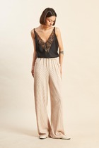 Модные брюки-кюлоты с элегантным запахом, свободной посадки, брючины широкие укороченные, чуть выше щиколотки. По переду молния, сзади по поясу вставлена резинка, запах фиксируется поясом на пряжке. С данными брюками можно смело создавать стильные комбинации с вещами Вашего гардероба. Длина брюк по боковому шву 92 см, шаговому — 62 см. Изделие подойдет на рост 170 см.