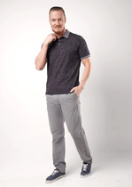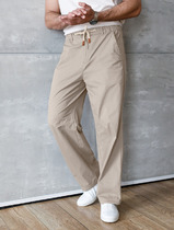 Брюки мужские из трикотажного полотна "лининг" свободного покроя, со смещенными к центрам передних половин боковыми швами, карманами в боковых швах и притачным поясом с эластичной тесьмой внутри. Нижние срезы обработаны подгибкой с эластичной тесьмой. Для регулирования степени прилегания изделия по талии предусмотрен шнурок, вставленный через две обметанные петли в центре пояса спереди.