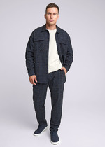 Брюки мужские из фактурного полотна на притачном поясе с эластичной тесьмой внутри, с карманами в боковых швах. Средний шов передней половины выполнен с имитацией застежки "гульфик". Для регулирования степени прилегания изделия в области талии предусмотрен шнурок из основной ткани, вставленный в пояс через две обметанные петли. Нижние срезы брюк обработагны подгибкой.