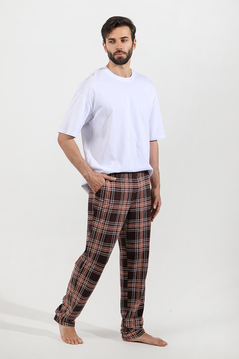 Брюки из полотна с набивным рисунком, классического покроя, прямые, на притачном поясе с эластичной тесьмой внутри, с карманами в боковых швах. Входы в карманы окантованы основным материалом.