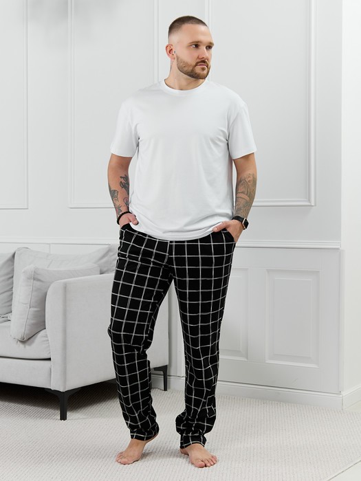 Брюки мужские из трикотажного полотна "кулирка" в клетку, свободного покроя, на притачном поясе с эластичной тесьмой внутри, с карманами в боковых швах. Нижние срезы обработаны подгибкой.
