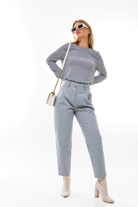 Комфортные брюки из плотного денима свободного кроя со складками и карманами по переду. Пояс притачной со шлёвками и центральной застёжкой на гульфик и молнию. По спинке изделия накладные карманы.
