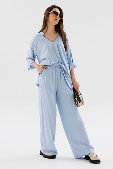 Брюки свободного кроя, верхний срез представлен широкой резинкой, с карманами.