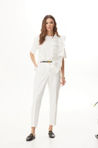 Прямые брюки с двойным поясом из отделочной контрастной ткани. Изделие по линии талии на резинке с имитацией гульфика. Карманы с отрезным бочком.