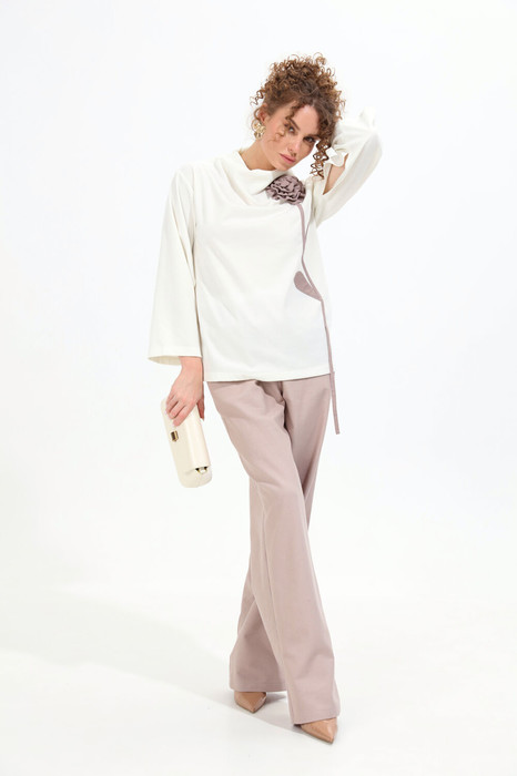 Прямые брюки с двойным поясом из отделочной контрастной ткани. Изделие по линии талии на резинке с имитацией гульфика. Карманы с отрезным бочком.