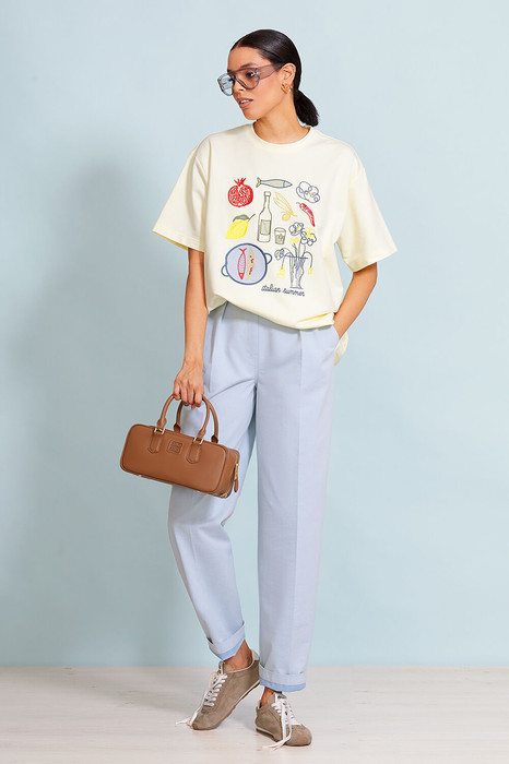 Джинсы свободного кроя, зауженные книзу.  Изделие высокой посадки, на поясе. Пояс со шлевками для ремня, боковые карманы   на передних половинках и прорезные карманы-обманки сзади. На передних половинках брюк по две односторонние складки.  Брюки можно носить как в отвернутом виде, так и с подвернутом.