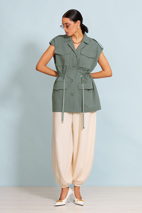 Брюки  выполнены из премиального трикотажного полотна. Брюки  свободного кроя, пояс  на резинке. Карманы в  боковых швах.   Передние и задние половинки брюк  с дополнительными выточками по низу. Низ брюк на резинке.  Сзади прорезной карман-обманка.  По поясу вставлен декоративный шнурок.