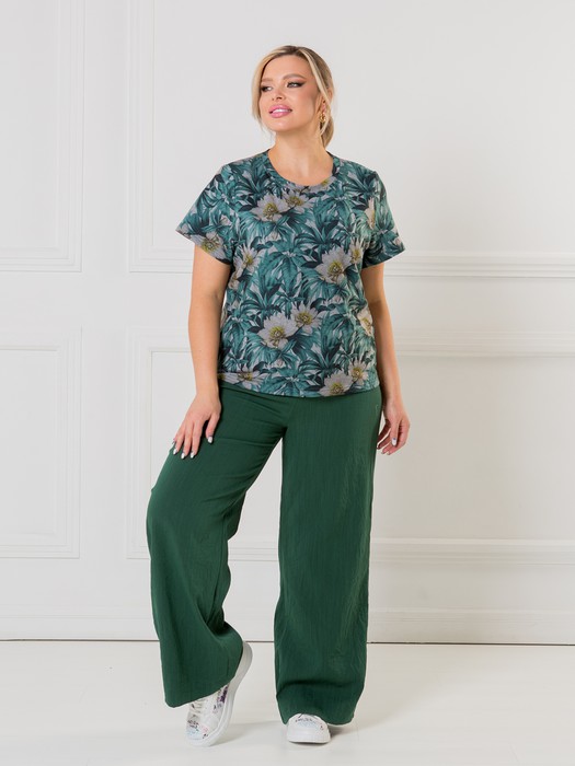 Удобные повседневные брюки-палаццо, выполнены из плательной ткани с эффектом крэш. Брюки по спинке с поясом, пояс собран на резину, по переду двойная притачная кокетка. Брюки без застежек и подклада. Длина по внешнему шву (с поясом) в 50 р-ре – 105 см. в 64 р-ре – 110 см., длина по внутреннему (шаговому) шву в 50 р-ре – 80 см. в 64 р-ре – 80 см.