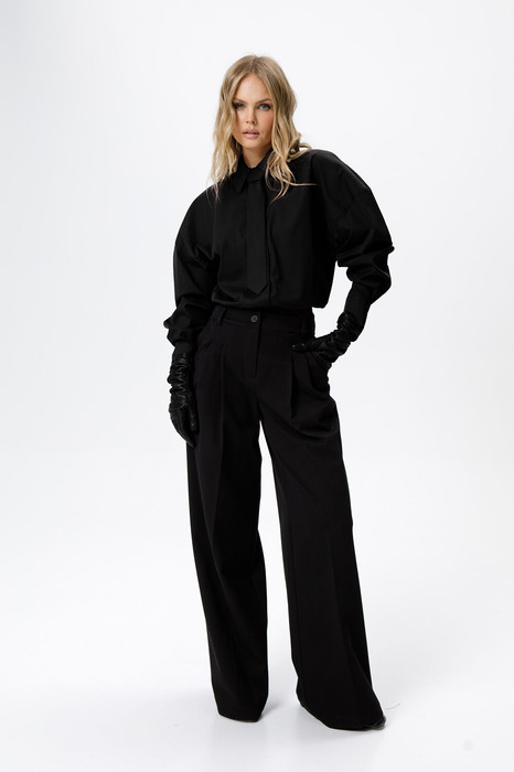 Детали: широкие брюки-палаццо с небольшими складками у пояса и заутюженными стрелками, притачной пояс со шлевками, застежка на молнию и пуговицу, боковые карманы. Задние части брюк с вытачками и имитацией карманов.