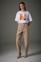 Брюки женские из текстильной ткани, слегка заужены к низу. В боковых швах расположены карманы. По низу передних половинок есть защип. Задняя половинка брюк с отрезной кокеткой и накладными карманами. Вверх брюк обработан поясом с резинкой (без молнии).  ПОЯС  ВХОДИТ В КОМПЛЕКТ.
