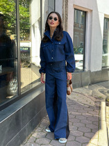 Модель прямого силуэта, на подкройном поясе, со шлёвками. Спереди карманы в подрезных бочках. Застёжка на молнию и крючки на поясе. Сзади прорезные карманы в рамку с фигурным клапаном-петлёй, который застёгивается на пуговицу.