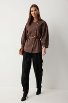 Модель свободного кроя, на притачном поясе, со шлёвками. Сзади пояс присборен на резину. Спереди защипы и карманы с листочкой. Застёжка на молнию и крючки на поясе. Сзади прорезной карман с листочкой. Ремень в комплект не входит.