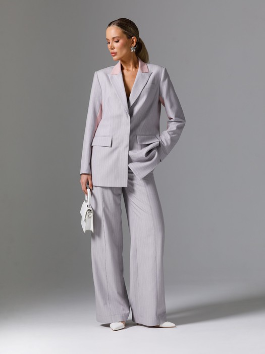 Модель прямого силуэта, на подкройном поясе, со шлёвками. Застёжка на молнию, потайную пуговицу и крючки на поясе. Спереди карманы в подрезных бочках и вертикальные подрезы, обработанные швами с открытыми срезами. Сзади прорезные карманы в рамку. Ремень в комплект не входит.