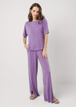Брюки женские из эластичного трикотажного полотна, прямого от бедра кроя. По передним половинкам брюк расположены фигурные карманы. По передним и задним половинкам заутюжнены канты. Пояс брюк притачной, с эластичной тесьмой-резинкой.