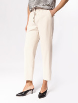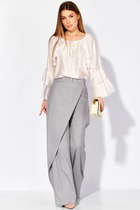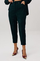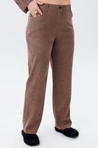 Брюки классической формы, зауженные к низу со стрелками по передним и задним половинкам. По низу брюк манжеты. Верхний срез брюк обработан поясом с резинкой по боковым швам. На задних половинках расположены талиевые вытачки, в боковых швах – наклонные карманы. Перед обработан поясом фигурной формы и декоративным клапаном, на котором пришита пуговица. В комплект входит контрастный узкий ремень.