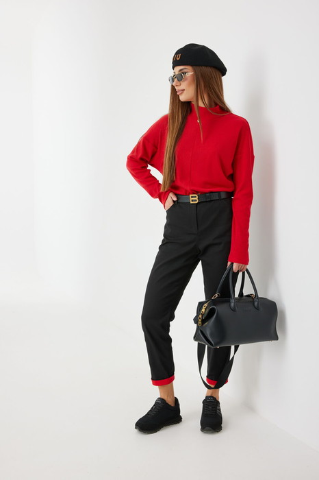 Средняя посадка, пояс притачной, застежка спереди на молнию и джинсовую пуговицу. По переду боковые карманы, сзади под кокеткой накладные карманы. Внутренний пояс и отвороты по низу брюк красного цвета.